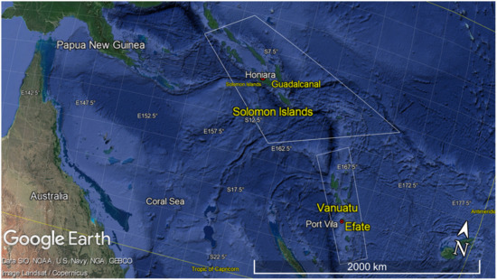 This study details examples from Melanesia in the South Pacific Ocean and uses Guadalcanal and Efate, two of the main islands in Solomon Islands and Vanuatu, as case study areas. The Vanuatu Archipelago is a group of volcanic islands about 1800 kilometres northeast of Australia (Figure 2). It comprises six provinces with the capital Port Vila located on the island of Efate. Solomon Islands is a sovereign country that consists of 6 major islands and over 900 smaller islands, with the capital and largest city, Honiara, located on the island of Guadalcanal (Figure 2). Efate and Guadalcanal have total land areas of 898 km² and 5302 km², respectively, and present three different types of habitats typical of tropical seascapes: coral reefs, mangrove forests and seagrass meadows [47]. Nine species of seagrasses have been identified in Solomon Islands, and thirteen in Vanuatu [11]; however, the spatial distribution and areas of seagrass meadows is currently unknown in both islands. Anthropogenic pressure is mainly related to agricultural, sewage and industrial inputs into the coastal zone, logging and/or mining and accompanying water quality issues (e.g., [48,49,50,51]).