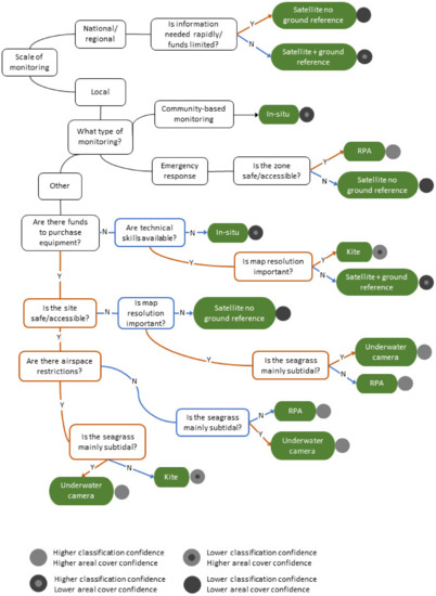The data-poor seagrass-monitoring toolbox decision tree. The tree asks a series of questions relating to monitoring requirements; orange lines represent ‘yes’ and blue lines represent ‘no’. Green boxes show the suggested tools. ‘Ground reference’ is the collection of site-based data to train or validate the remote sensing tools; this is mainly interpreted as in situ surveys, though RPA and underwater imagery is used for this purpose by some. The circles represent the degree of confidence in the ability to classify the seagrass and in estimations of areal cover for each tool (confidence in areal cover estimations is low for tools with low spatial resolution because they will be less able to detect localised patchiness in seagrass cover).
