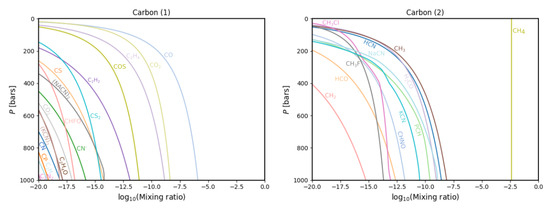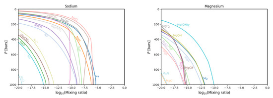 where p i v a p ( T ) is the vapour pressure of species i. Where this value is equal to 1, the condensate is stable and present. Below 1, it is unstable and, therefore, not present. Until saturation is achieved, the condensates are removed from the model so that an element is depleted according with increased height [23]. GGchem was benchmarked to the code TEA [24,25]. We also tested GGchem by reproducing the results from Fegley and Lodders (1994) using the same initial parameters and concerning the most abundant species (besides the ubiquitous hydrogen and helium), namely C, N, O, Na, Mg, Si, P, S, and K. GGchem uses a thermal profile and elemental abundances as input parameters for construction of the chemical models.