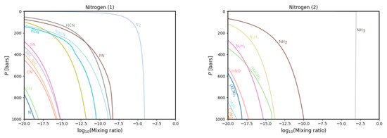 Figure 3, Figure 4, Figure 5, Figure 6 and Figure 7 give the complete collection of chemistries for the aforementioned elements, of which Figure 2 is only a selection. Comparing our results with those by Fegley and Lodders (1994), it is clear that the NH 3 , N 2 and H 2 O mixing ratios are higher, which is consistent with the increased elemental enrichments of oxygen and nitrogen from the new Juno measurements. The same holds for CH 4 and H 2 S but from the Galileo measurements postdating those calculations.