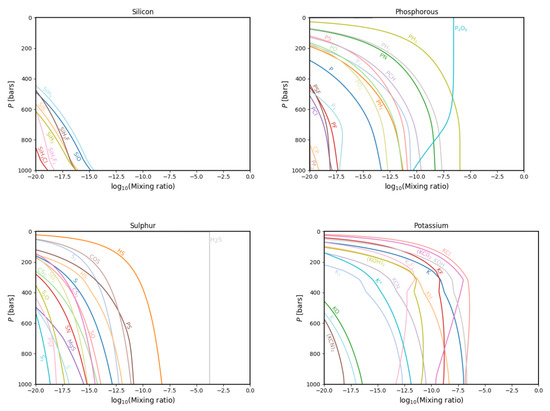 Figure 7. The same as in Figure 3 but for the silicon (top left), phorphorous (top right), sulphur (bottom left) and potassium (bottom right) gas phase chemistries.