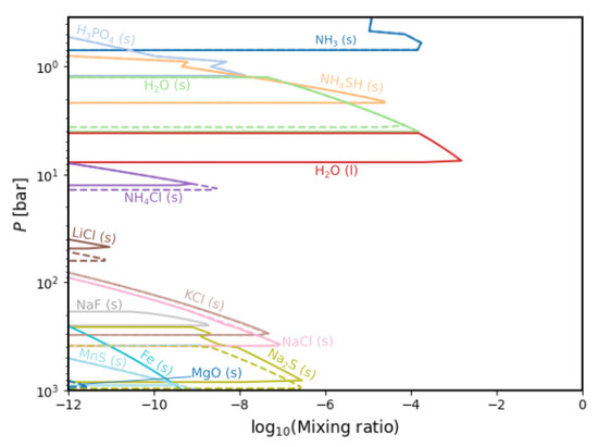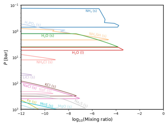 The results for the condensation chemistry generally correspond with observations and prior models starting with NH 3 (s), NH 4 SH (s) and H 2 O (s, l) clouds dominating the upper layer of the atmosphere. At this level, we also find H 3 PO 4 (s), which is remarkable since we do not find it as a gas species in our models, as is the case in Wang (2016) [12]. Nevertheless, we note that the model by [12] considers disequilibrium chemistry, and this might be the source of the main differences. Continuing in depth, our models show a chlorine-dominated region with several sodium species below that.