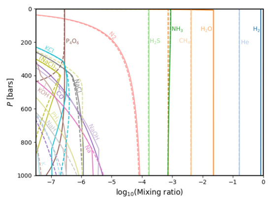 At lower mixing ratios, species bearing potassium, sodium, phosphorous and chlorine are present. The abundance of the most abundant species, H 2 , He 2 , H 2 O, CH 4 , NH 3 and H 2 S, does not seem to vary with pressure. However, this variation does exist; however, because these species are =very abundant (they are the dominant carriers of S, N and C, respectively), these variations are incredibly minute and cannot be seen on a logarithmic scale. For instance, NH 3 decreases in abundance with altitude, from 10 3.07 mixing ratio at the minimal pressure value to 10 3.16 mixing ratio at 1000 bars, due to depletion into the condensate phase; however, the condensate abundance and gas phase abundance are apart in two degrees of magnitude.