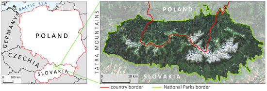 The study area covered the core and buffer zone of the UNESCO Tatra Transboundary Biosphere Reserve, occupying nearly 1000 km2 area, which is formed by the Polish Tatra National Park (TPN) and Slovakian Tatranský národný Park (TANAP), with area shares of 22% and 78%, respectively (Figure 1). The Tatras are the highest mountain range in the Carpathians, with some peaks exceeding 1500 m. The High Tatras are characterized by alpine ecosystems. Erosion-resistant granodiorite is the dominant substrate of the High Tatras, which are located in the eastern part of the Tatras; the southern part of the western Tatras consists of the metamorphic rocks; the northern part is characterized by less resistant formations: carbonate rocks [32]. The climate of the Tatras is highly variable, depending on the altitude. The average annual temperature varies between 4 and −3 °C, whereas mean temperature in the coldest and warmest month varies from −6 to −11 °C and 4 to 15 °C, respectively [33]. The number of days with snow cover ranges from 120 to 220 days, and annual precipitation varies from 1000 to 1700 mm, increasing with altitude [33]. The annual mean total cloud cover for 1991–2020 was 68%, which was calculated based on ERA5 (European Centre for Medium-Range Weather Forecasts (ECMWF) Reanalysis 5th Generation) climate reanalysis data [34]. Strong foehn winds cause serious forest stand damage and windthrow, which accelerate the changes in vegetation cover [35]. The long snow cover duration, high precipitation, large total cloud cover [36], and short growing season create challenges for obtaining remote sensing data of vegetation in this area.