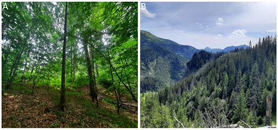 Broadleaf (A) and coniferous (B) forest stands in the Tatra Mountains. Photo credit: M. Kluczek, 2022.