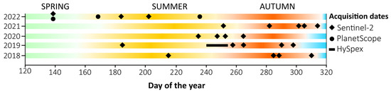 Sentinel-2 cloudless acquisition dates for years 2018–2022, depending on vegetation season; the start and end dates of vegetation were differentiated in the analyzed years. Source: Calculated based on ERA5 climate reanalysis data [34]. In the case of the HySpex image, due to a frequent cloud cover, the size of the area, significant elevation differences (this required flightlines at different altitudes to acquire comparable pixel sizes for the whole area), the area of the park was acquired in different periods.
