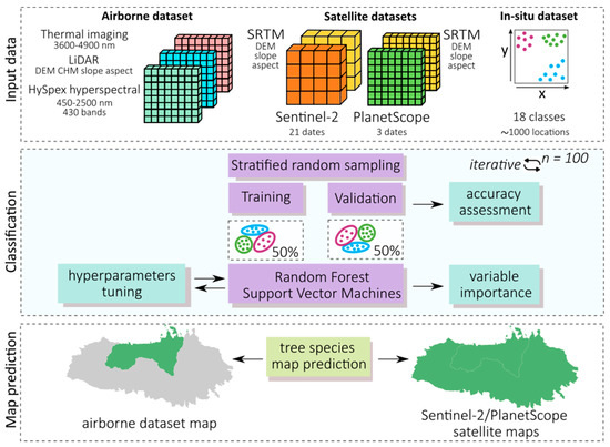 Main steps of processing procedure. As input data, we used: (1) airborne hyperspectral HySpex, thermal images, and LiDAR point cloud data; (2) multitemporal Sentinel-2, PlanetScope images, and Shuttle Radar Topography Mission (SRTM) satellite data; and (3) field-verified patterns of dominant tree species as reference data. First, we optimized the parameters of the random forest and support vector machine classifiers. Second, iterative classification was performed, repeating the procedure 100 times based on the prepared training and validation (50:50) sets. As output variables, we determined the importance of the used satellite spectral bands, obtained maps of tree species, and calculated their classification accuracies.