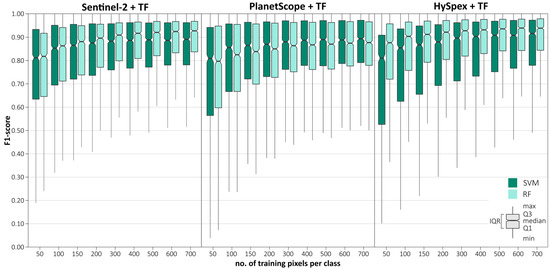 In the first stage, we aimed to determine the effect of the number of pixels on classification accuracy (from 50 to 700 pixels; Figure 6). We obtained the highest median F1-score for the maximum number of pixels used (700): Sentinel-2 (0.93 RF; 0.89 SVM), PlanetScope (0.89 RF; 0.87 SVM), and HySpex (0.95 RF; 0.92 SVM). The results for the HySpex data were characterized by a high interquartile range (0.15–0.38), with a particularly large difference between the SVM and RF algorithms (by 0.06–0.15), followed by the PlanetScope data (0.17–0.31). We observed the narrowest range for the Sentinel-2 data (0.11–0.23); however, in this case, we found no difference between RF and SVM (0.01–0.05). As the number of pixels increased, the interquartile ranges of the results tended to decrease, by 0.03 per 100 pixels on average. The range increased by an average of 0.02 for every 100 pixels, with the largest increase observed between 50 and 200 pixels (by 0.04–0.09), whereas the difference between 50 and 700 pixels was 0.09–0.13. The results stabilized between 500 and 700 pixels and then changed little (0.01–0.02). Therefore, we considered the value of 700 pixels as optimal, which we used for further classification and analysis.