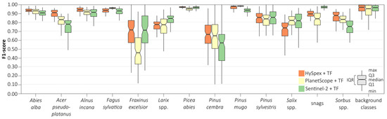 We conducted an iterative assessment of classification accuracy for each class depending on the dataset used based on the random forest (Figure 8) and support vector machines (Figure 9) classifiers. We obtained the highest median scores (above 0.90) for all remote sensing sets for the following classes: silver fir (Abies alba; 0.91–0.95), European beech (Fagus sylvatica; 0.92–0.96), Norway spruce (Picea abies; 0.97–0.98), dwarf mountain pine (Pinus mugo; 0.95–0.99), and grey alder (Alnus incana; 0.87–0.92). We obtained the lowest ones for European ash (Fraxinus excelsior; 0.44–0.72), Swiss stone pine (Pinus cembra; 0.58–0.78), and Scots pine (Pinus sylvestris; 0.67–0.85), which were also characterized by wide median differences (0.02–0.25) among the results obtained between the different remote sensing datasets. The widest interquartile range (IQR) was obtained for rare classes: European ash (Fraxinus excelsior; 0.10–0.32), Swiss stone pine (Pinus cembra; 0.20–0.27), and Scots pine (Pinus sylvestris; 0.12–0.38); we obtained the narrowest IQR for silver fir (Abies alba; 0.03–0.05), sycamore (Acer pseudoplatanus; 0.04–0.08), European beech (Fagus sylvatica; 0.01–0.05), Norway spruce (Picea abies; 0.01–0.02), and dwarf mountain pine (Pinus mugo; 0.01–0.02). We observed similar patterns for the SVM classifier, but these interquartile ranges for most classes were notably wider (by 0.01–0.07). Analyzing various classification scenarios, we found that random forest produced the most accurate classification results on Sentinel-2 and PlanetScope images, whereas support vector machine was more appropriate for HySpex data.