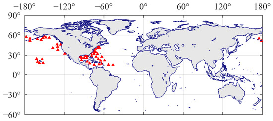 We collocated wind measurements from Standard Meteorological data of 56 NDBC buoys operated by the NDBC during the same period of HSCAT-D winds. To avoid the impact of land pollution on the accuracy of winds measured by the HSCAT scatterometer, only buoys with an offshore distance greater than 50 km were used. The geographical locations of the collocated buoys in this work are presented in Figure 1.