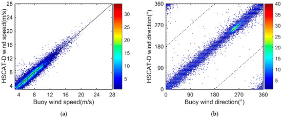 Figure 2 shows the scatterplots of wind derived from HSCAT-D versus NDBC buoy wind. The direction scatter plot reveals the characteristics of the wind direction distribution: there are sporadic sample distributions in the upper left and lower right corners, which can be attributed to the cross-360° wind direction problem.
