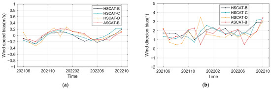 The bias of scatterometer wind speed (a) and direction (b) versus buoys from June 2021 to October 2022.