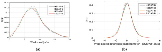 Wind speed probability distribution functions of each scatterometer (a) and wind speed deviation PDFs of scatterometers vs. ECMWF data (b).