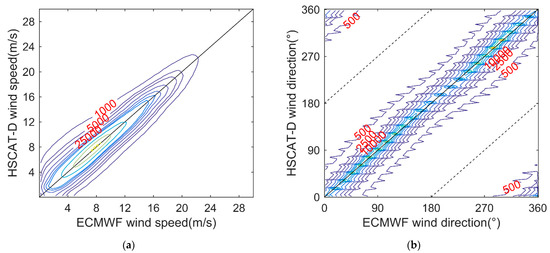 The overall statistical results are reported in Table 3. Screened by the KNMI QC discrimination, the rejected ratios of HSCAT-D, HSCAT-B, HSCAT-C, and ASCAT-B were 7.7%, 6.3%, 6.5%, and 1.0%, respectively. For ASCAT, the QC-rejected ratio was smaller because the influence of rainfall on C-band observations was less than that of the Ku-band. The ECMWF data and HSCAT-D wind speed and direction agreed well, i.e., the STDs of wind speed differences was 1.15 m/s. In contrast to the scatterometer–buoy comparison result, the wind speed biases between HSCAT and ECMWF were all slightly positive, and the mean value of HSCAT-D was 0.09 m/s. This may be due to HSCAT winds being compared to ECMWF real winds, which are on average 0.2 m/s lower than ECMWF stress-equivalent winds [17].