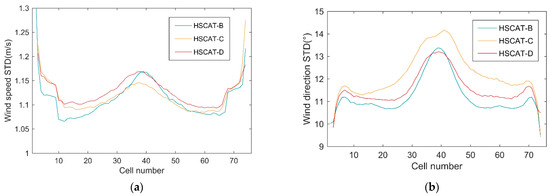 All of the HSCAT scatterometers carry a rotating dish antenna with two pencil beams that sweep in a circular pattern, resulting in systematic cross-track variability in the accuracy of the wind retrieval. In terms of wind speed standard deviation, Figure 7a compares the wind differences between HSCAT and ECMWF as a function of the cross-track WVC index. When wind vector cells are located in the nadir swath (Cell Number in [20,60]), the wind speed difference STDs of the HSCAT-D are less than 1.2 m/s. For the outer swath (Cell Number in [1,10] and [69,76]), where only vertically polarized beams can illuminate, the standard deviations increased rapidly and the accuracy of wind products degraded in the edge swath. For the wind direction, noticeable differences were also found in the middle and edge of the swaths. The overall cross-track wind direction difference STDs of HSCAT-D and HSCAT-B were less than 4°. However, the wind direction difference STD of HSCAT-C was slightly larger (by approximately 1°).