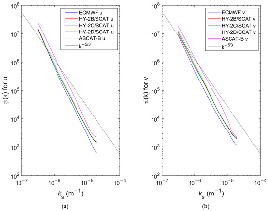 Spectra of the HSCAT-B (red), HSCAT-C (green), HSCAT-D (black), and ASCAT-B (pink) wind and ECMWF background real wind (blue) for (a) u-component and (b) v-component.