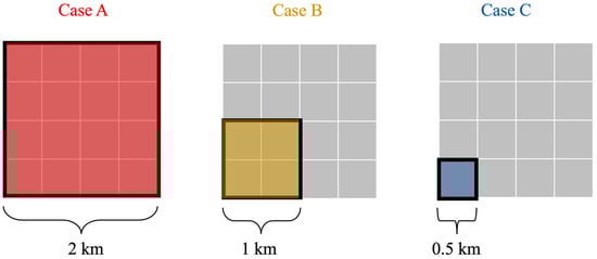 Illustration of three resampling cases. Case A represents averaging all 0.5-km pixels in the 2-km resolution pixel to represent the reflectance in the whole 2-km pixel. Case B represents averaging a block of 4 0.5-km sub-pixels to represent the reflectance in a 1-km pixel, and using that average as the sub-sampled 1-km pixel to represent the 2-km super-pixel reflectance. Case C uses the reflectance in one 0.5-km sub-pixel to represent the reflectance in the whole 2-km super-pixel.