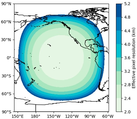 where H is the distance between the satellite and its sub-point super-pixel. The angular location of the GOES-17 sub-point (nadir point) is (0, −137.1999969). The ratio of H to L should equal the ratio of r1 to the enlarged super-pixel radius (r2). Therefore, we can get the enlarged super-pixel radius (perpendicular to the satellite viewing path) through this relationship: