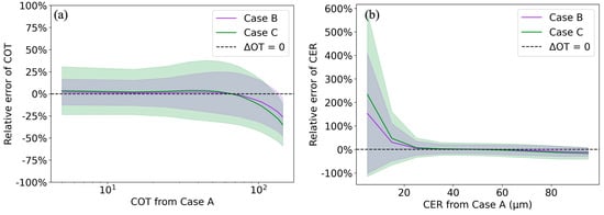 Relative errors of Case B and Case C as a function of (a) COT or (b) CER retrieved from pixel-averaging as in Case A. The shaded regions show ±1 weighted standard deviation.