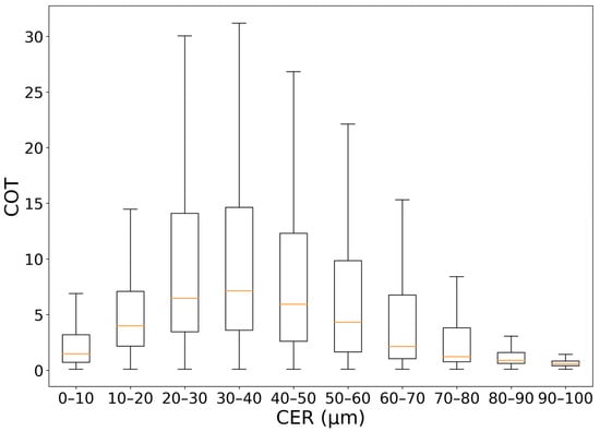 Comparing Figure 5a,b, the average value and weighted standard deviation of the CER relative error is much higher than that of the COT relative error. The maximum value of the mean CER relative error is about 250% for the smallest particles (1 µm) in Case C, decreases to near zero when the Case A CER is between about 25 and 60 µm, and the relative error is negative for larger CER values. Figure 6 shows the distribution of COT in different CER intervals. The CER relative error at CER is <20 µm and mainly comes from optically thin clouds (COT < 5) that have positive COT relative errors. Because of the nonorthogonal correlation between COT and CER, the relative error of CER is positive. Since the CER is more sensitive to changes in band 2 caused by sub-sampling, as the COT is small, the scale of the relative error of the CER is much larger than that of the COT. For example, if the CER is so small that is close to the lower boundary limit (1 µm), the COT will be less than 5, as discussed above, and the nonorthogonal correlation between COT and CER will be extremely strong, as illustrated in the lower-left portion of Figure 4. In this case, a slight bias in the COT retrieval results, which is caused by the sub-sampling method, can lead to a significant bias in the CER retrieval. The COT becomes relatively larger when the CER ranges from 20 to 60 µm, in which case COT and CER are almost orthogonal. In this case, changes in COT are nearly independent from CER, and the relative error of CER is close to 0 in this interval. Although the COT is still small for clouds with CER > 60 µm, the relative error of CER is negative due to the boundary limitation set in the retrieval system.