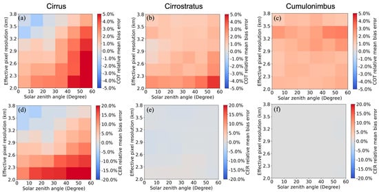 Figure 7a,d show a similar pattern, which indicates a good correlation between the relative error of COT and CER. This is due to the nonorthogonal correlation between COT and CER retrievals for Cirrus clouds that have small COTs. The relative error of the CER from Cirrostratus and Cumulonimbus clouds, shown in Figure 7e,f, remains near 0 regardless of the pixel resolution and SZA. Since the correlation between the COT and CER is close to orthogonal when the optical thickness is large, this verifies the previous point that changes in COT are nearly independent of CER in this case, thus the distribution of the COT relative error for these two types of clouds does not have much impact on the relative error of CER.