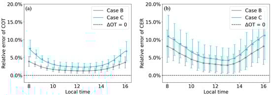 Relative error of (a) COT and (b) CER in Case B and Case C as a function of LT, based on GOES-17 retrievals for high clouds.