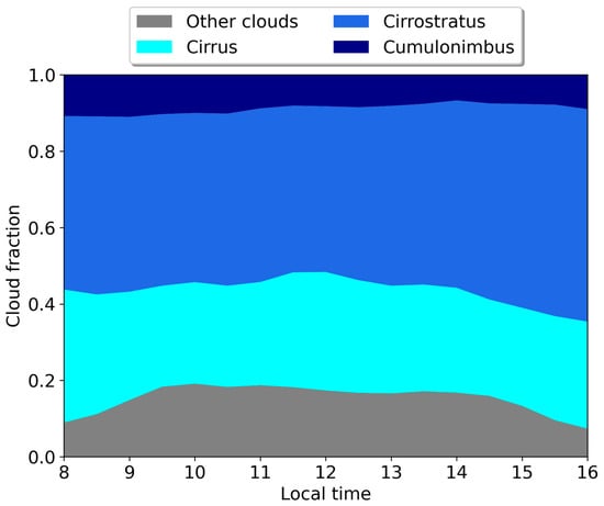 We use the ISCCP cloud classification criteria in Table 2 to stratify the temporal dependence of the COT retrieval errors with different high cloud types. Figure 9 shows the diurnal variation of the fraction of cloud types based on the GOES-17 CTP product, and COT retrievals of ice clouds from Case A, which are identified by using the GOES-17 cloud top phase product. From Figure 9, cirrostratus clouds dominate in the high cloud category, and cirrus is the second most abundant cloud type. Since the Nakajima–King retrieval method has a limited sensitivity to optically thin clouds [44], the amount of cirrus clouds can be underestimated.