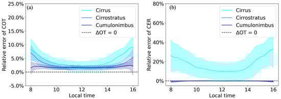 Figure 10 shows the time-dependent COT and CER relative retrieval errors from each high cloud type shown in Table 2. In Figure 10a, the relative errors of COTs from cumulonimbus clouds have little dependence on LT, they remain at about 2.5% as the LT changes. However, in Figure 10a, the maximum of the COT relative errors from cirrus and cirrostratus clouds reach around 10% and 7.5%, respectively, at 8:00 LT and 16:00 LT (Figure 10a), which could be due to a stronger partial cloud coverage effect and relatively larger cloud fractions of cirrus and cirrostratus clouds compared to cumulonimbus clouds. The large SZA that appears at these two LTs could indicate a cloud 3D effect which biases the COT retrieval results. This could be the reason that the COT relative errors of cirrus and cirrostratus clouds have two peaks, that occur in the morning and afternoon. The variation of the COT relative errors from all types of high clouds, shown in Figure 8a, have similar trends, which indicates that the COT retrieval biases caused by sub-sampling are mainly contributed by cirrus and cirrostratus clouds. For the CER retrieval biases shown in Figure 10b, cirrus clouds provide the largest relative error around 8:00 and 16:00 LT, which corresponds to the two peaks of the CER relative error seen in Figure 8b. The relative errors of the CER from cirrostratus and cumulonimbus clouds are close to zero, and show little variation with LT due to the orthogonal correlation between COT and CER. Therefore, the relative error of the CER is mainly attributed to cirrus clouds.