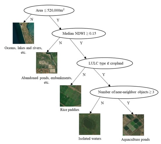 - Zeng, Z.; Wang, D.; Tan, W.; Huang, J. Extracting Aquaculture Ponds from Natural Water Surfaces around Inland Lakes on Medium Resolution Multispectral Images. Int. J. Appl. Earth Obs. Geoinf. 2019, 80, 13–25. [Google Scholar] [CrossRef]