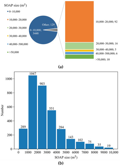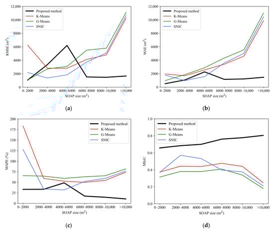- The proposed method showed better performance in segmenting SOAPs than K-Means, G-Means, and SNIC methods provided by GEE. The MIoU of our method was 0.6965, representing an improvement of between 0.1925 and 0.3268 over the comparative methods. The MIoUs of the proposed methods at all SOAP size classes were higher than those of the comparative methods, indicating that our method is superior to widely used image segmentation algorithms in segmenting SOAPs.