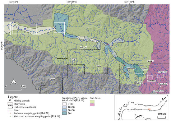 - Gafur, N.A.; Sakakibara, M.; Komatsu, S.; Sano, S.; Sera, K. Environmental Survey of the Distribution and Metal Contents of Pteris vittata in Arsenic–Lead–Mercury-Contaminated Gold Mining Areas along the Bone River in Gorontalo Province, Indonesia. Int. J. Environ. Res. Public Health 2022, 19, 530. [Google Scholar] [CrossRef]