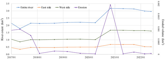 | River Extents (km2) | Eroded Extents (km2) | Eroded Volumes (m3) | |