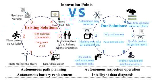 In order to solve the above problems, we have proposed innovations in autonomous flight, autonomous path planning, autonomous battery replacement, and intelligent detection and designed a new UAV inspection system, as shown in Figure 1. The main contributions of this paper are summarized as follows: