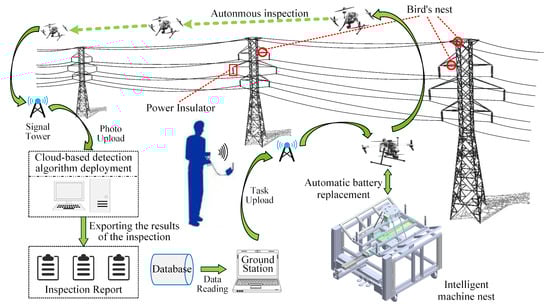 The structure of the system in this paper is shown in Figure 2. Firstly, the operator needs to request the basic data of the high-voltage towers from the ground station and generate inspection tasks to send to the UAV. After the drone’s self-inspection is completed, upon receiving the start command, it begins to perform the operation task and inspect the electric tower. The drone inspection process uploads the photos of the inspection target to the cloud server in real time. After receiving the photos of the inspection, the cloud server uses a combination of manual and deep learning to detect the photos from the inspection. Manual detection is mainly for when they are some defects in the line, while intelligent detection is mainly for the detection of bird’s nests in high-voltage lines, and the inspection report is generated after the detection is completed. After viewing the report, the staff can arrange maintenance personnel to carry out maintenance. After the drone completes its task, it returns to the intelligent machine nest, which will replace the drone’s battery autonomously to improve the inspection efficiency and prepare for the next inspection task.
