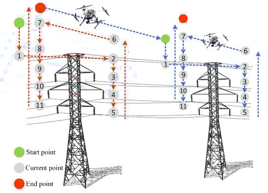 According to the fine inspection scheme shown in Figure 3, the specific inspection strategy is designed as follows: Starting the inspection task from the ground, when the inspection drone reaches the starting point position, it starts to descend in height to task point 1, i.e., after the same height as the ground line, it performs the task of taking pictures at that point. Then, it proceeds to mission point 2 at the ground wire and takes a picture of the ground wire. After the ground line photo operation is completed, then the inspection drone’s height is lowered to reach task point 3 at the upper phase position of the tower, task point 4 at the middle phase position, and task point 5 at the lower phase position, to complete the photo task corresponding to each corresponding point. When the tasks of the single-side tower are finished, the inspection drone is raised to cross-tower task point 6 and reaches task point 7 on the opposite side of the tower by moving laterally. There is no photo task at these two points, so the role is to allow the inspection drone to traverse towers at a safe height. On the other side of the tower, the inspection drone lowers its altitude to reach task points 8 to 11 and complete the photo task. When all the tasks of the first tower are performed, the inspection drone is raised to the termination point, and then it flies to the starting point of the next tower. The inspection drone continues to perform the above inspection actions according to the task data until it reaches the end of the mission; at this point, the fine inspection task is completed.