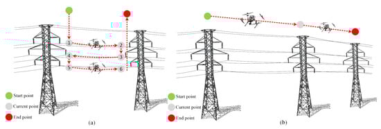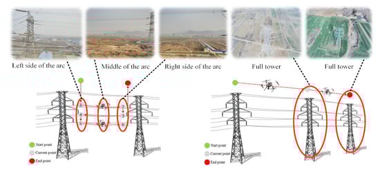 According to requirement 11 in Table 1, the arc-chasing inspection scheme is designed as shown in Figure 4a, and the 3D information of the task points can be obtained as described in Section 3.2.1. By using inspection drones to perform arc-chasing inspection tasks, operators can check whether the transmission lines are broken, damaged by by foreign objects, etc. According to requirement 12 in Table 1, the channel inspection scheme design is as shown in Figure 4b. Through the channel inspection task, operators can inspect the high-voltage line channel, which affects tower and line safety.