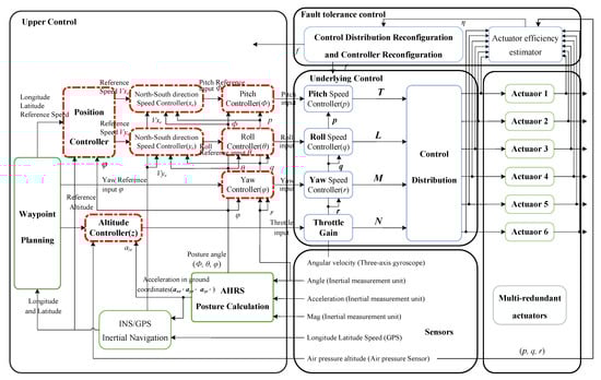 The whole UAV control system adopts the structure of position control, speed control, attitude control, and bottom stabilization control, as shown in Figure 5. With this approach, complex control problems can be decomposed, thus facilitating the design and implementation of the overall controller. The control objects of the position controller include the velocity controller, the attitude angle controller, the attitude angle rate controller, and the robot’s power system. When the UAV receives the latitude and longitude of the target point, sent by the ground station as the control input, it can perform position control by combining the real-time latitude and longitude information during the inspection, thus calculating the target value for speed control. Velocity control refers to the process of calculating the attitude angle target value in the UAV body coordinate system by the velocity error in the N and E directions. Since both the attitude angle controller and the attitude angle rate controller operate at a high frequency, the main characteristics of this data source are the low amount of error and stable acquisition in all environments. Therefore, the performance of the attitude angle controller as well as the attitude angle rate controller is usually relatively stable, and the performance of the speed controller directly determines the stability and accuracy of the flight process of the inspection robot.