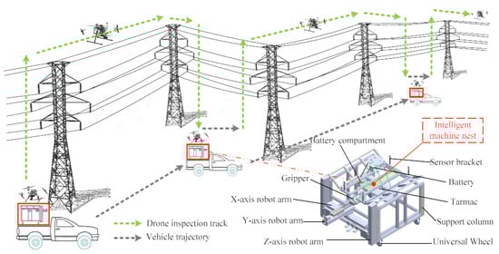 To improve the efficiency and inspection time, this paper designs a mobile inspection scheme, as shown in Figure 6. When the inspection drone starts to perform the task, the operator drives the vehicle to the ready landing position in advance and waits to replace the battery after the inspection drone work is completed. Transferring sites and putting away the equipment are completed during the inspection time period. The intelligent machine nest is able to charge the drone’s battery, which guarantees that the drone can carry out long inspection missions.