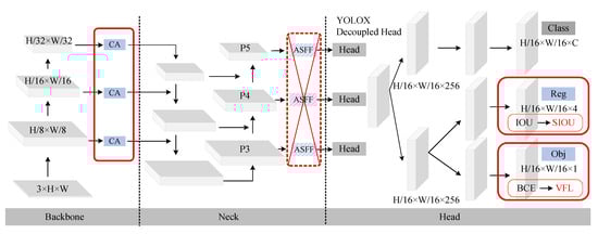 In order to improve the accuracy of the model, the following improvements are made in this paper based on the YOLOX_m network structure. Firstly, coordinate attention (CA) [] is introduced after the output feature map of backbone, which embeds the location information of the feature map into the channel attention. Then, the binary cross entropy (BCE) Loss in the confidence loss is changed to the varifocal loss (VFL) [], to solve the problem of the low confidence of the box where the location prediction is very accurate, i.e., the problem of unbalanced positive and negative samples. Finally, the SCYLLA-IoU (SIoU) [] loss function is introduced to improve the capability of the bounding box regression. We also tried to add adaptively spatial feature fusion (ASFF) [] after the output feature map of the neck, but the accuracy improvement on the validation set was very small and added a larger computational effort, so the trick was not increased. The structure of the improved YOLOX is shown in Figure 7.