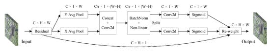 To make full use of the above information, the two feature maps generated by the previous module are first cascaded and then a shared 1 × 1 convolutional transform is used, as shown in Equation (15). The generated is an intermediate feature map of the spatial information in two directions, and denotes the downsampling scale.