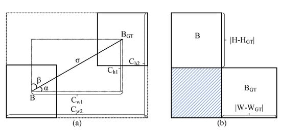 None of the above loss functions consider the angle, but the angle can indeed affect the regression, so the SCYLLA-IoU (SIoU) loss function was proposed by Gevorgyan et al. The SIoU loss function consists of four cost functions: angle, distance, shape, and IoU. The angle cost is shown in Figure 9a, where B is the prediction box and is the ground truth box. When the angle from B to converges to , the opposite converges to . The maximum value is obtained at . The specific definition is shown in Equation (22).