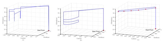 The inspection drone took off from an open area around the high-voltage tower and completed its operational tasks according to the inspection plan described in Section 3.2. To facilitate the viewing of the data, the latitude, longitude, and altitude of the inspection drone flight were transformed into the true distance in the (N, E, D) coordinate system, as shown in Figure 11. Taking Figure 11b as an example, the inspection drone took off from (0,0,0) and conducted a single-side arc-chasing inspection of two high-voltage towers in the distance, returning to (0,0,0) after the inspection task was completed. Its real flight trajectory was consistent with the trajectory depicted in Figure 4a in Section 3.2, and the flight trajectories in Figure 11a,c correspond to the planned trajectories in Figure 3 and Figure 4b, respectively. This shows that inspection drones are able to operate precisely according to the tasks planned in the ground station.