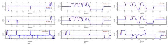 As can be seen from Section 3.3, the speed control of the inspection UAV is the core of the control system, and the tracking results of the speed control can reflect the stability of the UAV flight well. The results of the speed tracking for the three inspection tasks are shown in Figure 12. VelN, VelE, and VelD are the values of the speed in the N direction, E direction, and vertical direction, respectively. Red dashed lines are the speed target values and blue solid lines are the actual speed values. The flight data shows that the inspection drone has good speed tracking performance and stable flight during the actual operation.