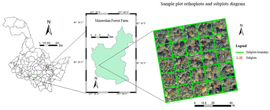 In this study, the sample plot survey data were collected in August 2019. Typical mixed coniferous forests were selected in the study area, 100 m × 100 m sample plots were established, and subplots were set at 20 m intervals in the sample plots, for a total of 25 subplots (as shown in Figure 1). Within each subplot, the tree diameter at breast height (DBH) of all trees with a diameter greater than 5 cm was measured using a tape measure, tree height was measured using a Vertex IV instrument with a height resolution of 0.1 m (Haglöfs, Sweden), canopy width was measured in four directions using a steel tape, and the species of each tree was recorded. In addition, the absolute positions of the four corners in each subplot were marked using a real-time kinetic (RTK) GNSS (UniStrong G10A, Beijing, China) with a positioning error of approximately 0.1 m. The coordinates of each tree were recorded using a handheld laser rangefinder by measuring the relative position of each tree in relation to the edge of the subplot. In total, 1372 trees were measured among the sample plots. Considering the number of plants, the main tree species in the forest were white birch, Manchurian ash, larch, Ulmus, and mongolica, with small numbers of other tree species, such as Korean pine and Amur linden.