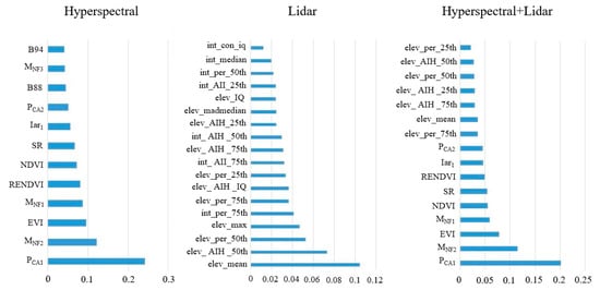 The categorical feature variables extracted from the two remote sensing datasets were screened according to the random forest OOB test, and the results are shown in Figure 4. Of these, 12 variables were extracted when only hyperspectral data were used as a single data source, 18 variables were extracted when only LiDAR data were used as a single data source, and 16 variables were extracted when both hyperspectral and LiDAR data were used (Figure 4). The figure shows that when both hyperspectral and LiDAR data were used, the importance of the variables extracted from hyperspectral data was higher than that of the variables extracted from LiDAR data. The spectral features reflected the absorption and reflection of electromagnetic waves of different wavelengths on the canopy surface, thus the spectral features of the vegetation deeply reflected differences in the physical and chemical properties of the different tree canopies, so they were more important than LiDAR features.