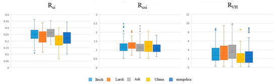 The classification results for each tree species in the sample plot are shown in Table 4. The overall accuracy of the multisource remote sensing cooperative classification was significantly higher than that of the classification using a single data source. Compared with that of the classification results using only LiDAR data, the accuracy of multisource remote sensing cooperative classification was improved by 22.24% on average. Compared with that of the classification results using only hyperspectral data, the accuracy of the multisource remote sensing cooperative classification was improved by 5.03% on average. After adding canopy morphological characteristics, the classification results shown in Table 5 were obtained. The classification results obtained before and after adding LiDAR-extracted canopy morphological features were compared, and the overall accuracy of the model was improved after adding the canopy morphological features. Additionally, the accuracy of the three classifiers was improved by 0.80% on average. The improvement of the random forest classifier was more obvious, reaching 1.10%, and the support vector machine classifier had the lowest improvement of 0.63%. The importance of the three canopy morphological characteristics is shown in Table 6, which presents the MDA of the three variables for the classification of different tree species. Among the three canopy morphological characteristics, the canopy rate index was the most important, the crown rate index was the second-most important, and the canopy volume ratio was the least important, leading to confusion in the classification of some tree species (MDA was negative). The box plots of the three canopy morphological features are shown in Figure 5. Clearly, the canopy morphological features extracted in this study differed among species. The interspecific variation of RCi was obvious, while RVH displayed less interspecific variation and more intraspecific variation, as well as more extreme values; therefore, the latter variable was not as effective as the first two in the classification.