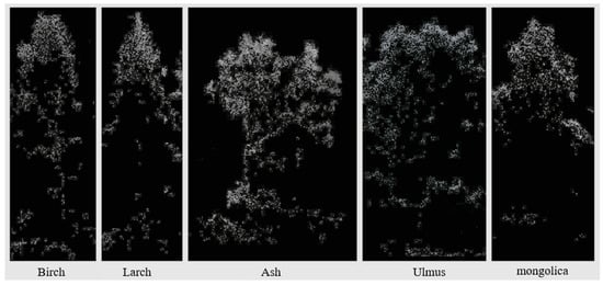 In addition, the most significant improvement in larch identification accuracy was observed with the inclusion of canopy morphological feature variables. This was due to the notable variation in canopy shape between conifers and broadleaf trees [33]. However, because of the small morphological differences in the canopies of individual broadleaf trees in the sample plots and the large density of stands in the sample plot with overlapping canopies, the improvement in classification accuracy was small. The canopy point clouds of different tree species are shown in Figure 7.