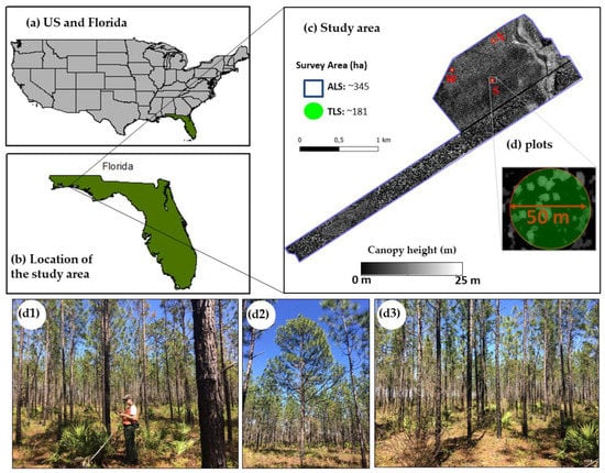 ALS can be used to acquire the vertical and horizontal forest structure in detail with laser pulses [18], and due to cost-efficiency and scale of operation, ALS has received by far the most attention for large area retrieval of forest structural parameters [19]. In particular, ALS has been applied for individual tree detection (ITD) over large areas, as well as for tree crown delineation, forest uniformity calculation, and canopy gap analysis [20,21,22,23]. Although airborne systems can cover large areas efficiently and relatively cost-effectively [24,25], difficulties persist in the observation of near-ground vegetation and the lower canopy characteristics [26]. In addition, the estimation of forest structural parameters using ALS faces a few persistent issues caused by factors such as species heterogeneity, tree density, and crown overlapping that are not simply resolved by increased lidar return density [8,13,16,27]. For instance, Silva et al. [8] realized the difficulty of modeling tree basal area due to the lack of linearity in the relationship between height and diameter of longleaf pine after this species reaches a diameter of ∼25 cm because longleaf pine height growth asymptotes at ∼25 m while the diameter continues to increase.