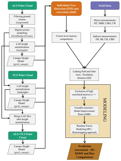where n is the number of trees; and are the observed and predicted values for tree i; and are the observed and predicted mean values for tree i; and relative RMSE (%) and biases (%) were calculated by dividing the absolute values (Equations (11) and (13)) by the mean of the observed values. Figure 2 displays an overview of the methodology used in this project.