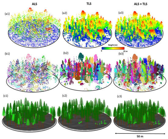 Illustration of the individual tree detection (ITD) and extraction from ALS, TLS, and ALS + TLS data in one of the plots: (a1–a3) raw point cloud of ALS, TLS, and ALS + TLS data colored by point height above ground; (b1–b3) point cloud trees of ALS, TLS, and ALS + TLS segmented by the ITD algorithm; (c1–c3) 3D representation of the trees in the plots retrieved from ALS, TLS, ans ALS + TLS data [64].